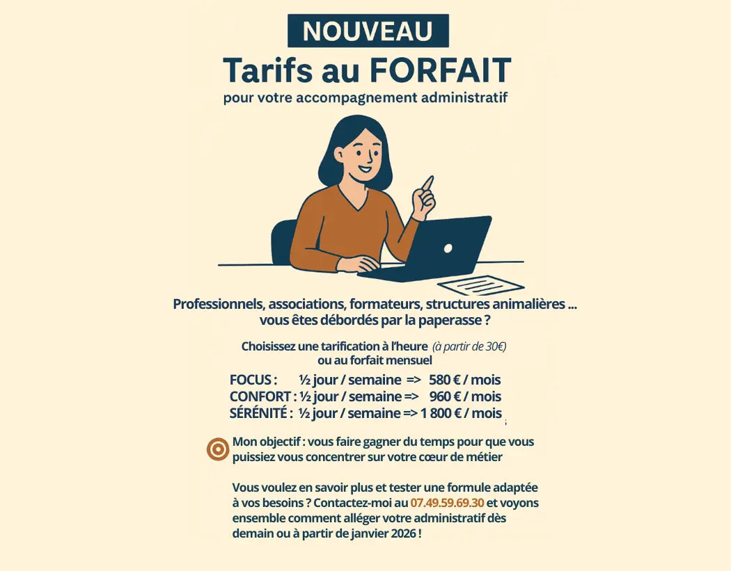 NOUVEAU - Forfaits pour les professionnels + d'informations Demander un devis Demande de devis × Nom Prénom Mail Téléphone Message Envoyer ma demande Ajouter à mes favoris Partager sur Descriptif de l'offre Professionnels, Associations, Particuliers,chacun a des besoins administratifs différents : certains veulent une aide ponctuelle, d’autres un accompagnement régulier. C’est pourquoi, mes prestations d’assistante administrative indépendante s’adaptent à cette réalité et mes clients peuvent désormais choisir la formule la plus adaptée :- une tarification à l’heure, pour les besoins ponctuels ou les missions ciblées,à partir de 30 €/heure, selon la nature de la mission- ou un forfait mensuel, pour un accompagnement régulier et un budget maîtrisé, sans engagement dans la durée :FOCUS = 1/2 jour par semaine 580 €/moisCONFORT = 1 jour par semaine 960 €/moisSÉRÉNITÉ = 2 jours par semaine 1 800 €/mois Quel que soit votre secteur d'activité, artisanat, commerce, TPE-PME, formation ou association, vous bénéficiez d’un soutien administratif sur mesure. Je vous accompagne dans la gestion administrative quotidienne : suivi, facturation, organisation, gestion des dossiers, communication ou assistance commerciale.