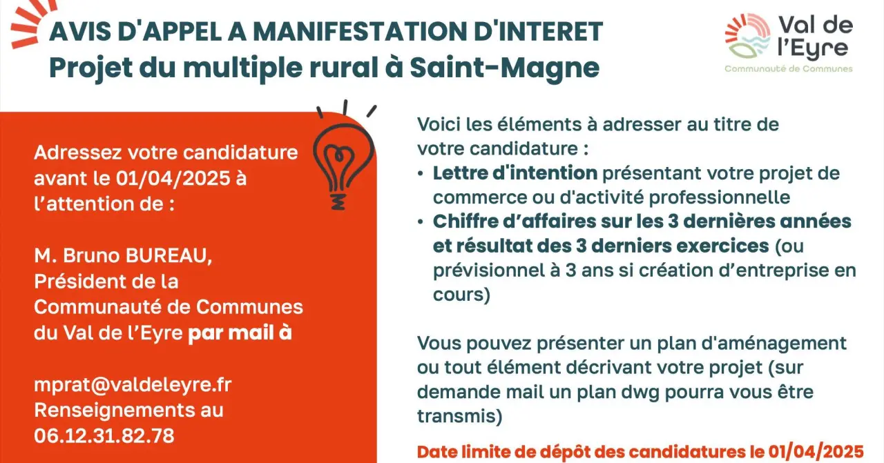Adressez votre candidature avant le 01/04/2025 à l’attention de M Bruno BUREAU, Président de la Communauté de Communes du Val de l’Eyre ou par mail à mprat@valdeleyre.fr
