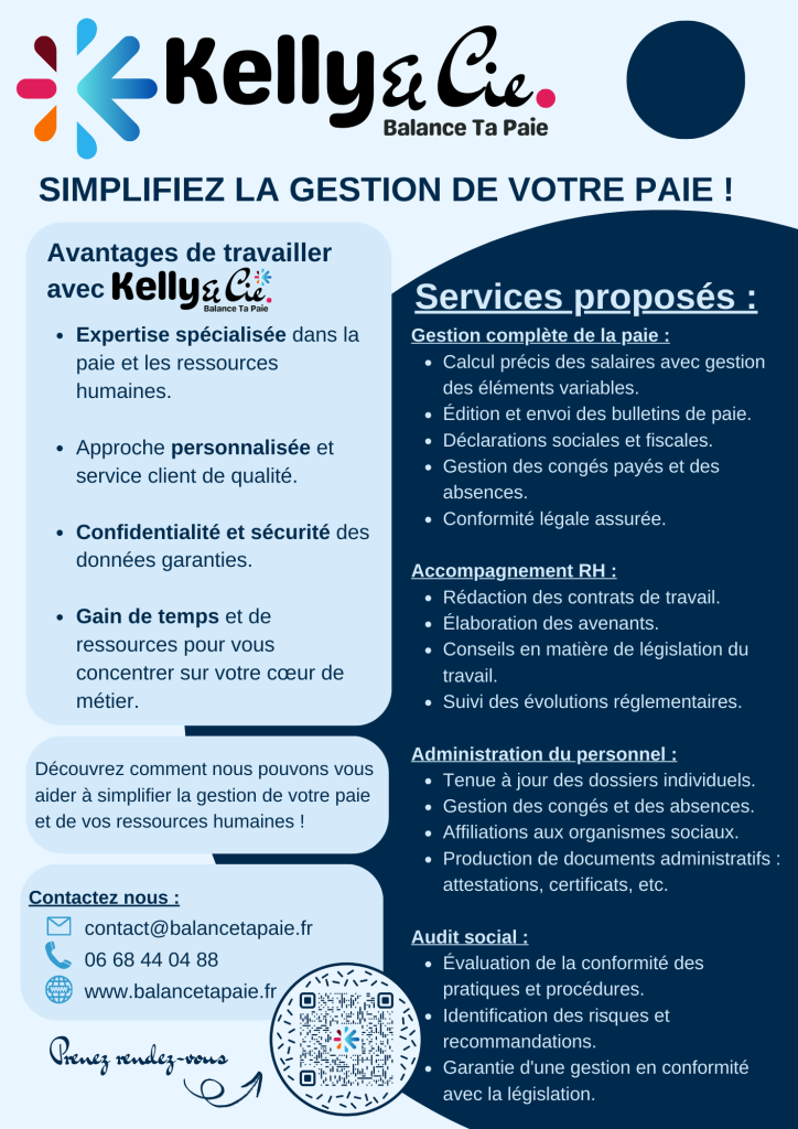 Previous Next Ajouter à mes favoris Partager sur Notre Histoire On vous propose Kelly & Cie | Balance Ta Paie - Expert paie indépendante - 33114Kelly & Cie est née d'une passion : la gestion de la paie. J'ai décidé de me lancer dans cette aventure entrepreneuriale en mettant à profit mes connaissances et mon expertise dans ce domaine. Ce qui a commencé comme une idée audacieuse est devenu une réalité florissante. Au fil des années, j'ai travaillé sans relâche pour perfectionner mes compétences et offrir des solutions de gestion de la paie sur mesure pour mes clients. Chez Kelly & Cie, je m'engage à simplifier la gestion de la paie pour mes clients. Forte de huit années d'expérience et d'une expertise approfondie dans ce domaine, mon entreprise propose des services d'externalisation de la paie sur mesure. Je travaille en étroite collaboration avec chaque client pour comprendre leurs besoins uniques et leur offrir des solutions personnalisées. Grâce à mon approche professionnelle et à mon engagement envers l'excellence, j'assure une gestion de la paie précise, fiable et conforme aux réglementations en vigueur. Avec Kelly & Cie, mes clients, peuvent se concentrer sur leur cœur de métier en toute tranquillité d'esprit, en sachant que leurs besoins en paie sont entre de bonnes mains. Demande de contact × Nom Prénom Mail Téléphone Message Envoyer ma demande