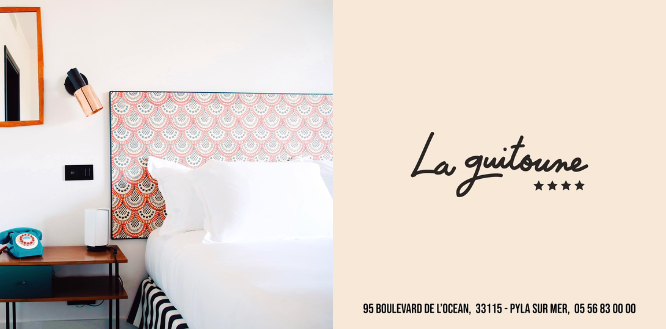Previous Next Ajouter à mes favoris Partager sur Notre Histoire On vous propose La Guitoune, hôtel**** restaurant à Pyla-sur-Mer 33115À deux pas de la plage, dans un écrin de verdure calme, La Guitoune fait peau neuve ! Cet hôtel à Pyla-sur-Mer, au bord de mer, vous accueille toute l’année, pour dormir, déjeuner, savourer un thé ou faire la fête, à proximité de la Dune du Pilat. Chaque passage à La Guitoune est unique. La décoration colorée, composée d’imprimés, de mobilier chiné et l’ambiance musicale vous feront voyager à la grande époque de ce musique-hôtel, dans les années 40 à 70. Laissez-vous surprendre par les prestations de haut standing de ce boutique-hôtel à Pyla-sur-Mer qui a fait les beaux jours du Bassin d’Arcachon.Pour la petite histoire...Après quelques années endormies, à être passée entre différentes mains, La Guitoune renaît. C’est en 2016 que deux architectes Bordelais, Ducos et Rougier, avec l’aide de Bambi Sloan, ont mis un coup de baguette magique sur l’hôtel mythique de Pyla-sur-Mer. Ils ont su associer une façade classique basque, avec la décoration inimitable de Bambi Sloan. Désormais, La Guitoune compte un bar, un restaurant et un hôtel avec 24 chambres confortables.Découvrez l'histoire de La Guitoune ici Oubliez les codes conventionnels de l’hôtellerie classique et laissez-vous surprendre par un voyage inouï proposé par La Guitoune, l’hôtel 4 étoiles de charme à Pyla-sur-Mer, à proximité de la Dune du Pilat. La Guitoune fait son grand retour, pour redevenir le lieu mythique du Pyla des années 40 à 70, où tous les Pylatais et les Bordelais se pressaient de venir déguster le fameux homard à l’américaine de Madame Scappazzoni. Que vous veniez pour un voyage d’affaires, un long séjour en famille, un week-end romantique ou des retrouvailles entre amis, vous serez reçu chaleureusement par la « Guitoune Family », l’équipe dynamique et attentive de votre hôtel proche des plages à Pyla sur Mer. Le temps d’un repas dans le restaurant à la cuisine de saison et traditionnelle, d’une soirée dans notre bar où la diversité musicale est reine, de quelques nuitées dans notre boutique-hôtel, d’un séminaire ou d’un événement privé, la décoration pensée par Bambi Sloan, le repas, les cocktails frais et la douceur des chambres sauront enchanter votre passage à La Guitoune. Demande de contact × Nom Prénom Mail Téléphone Message Envoyer ma demande