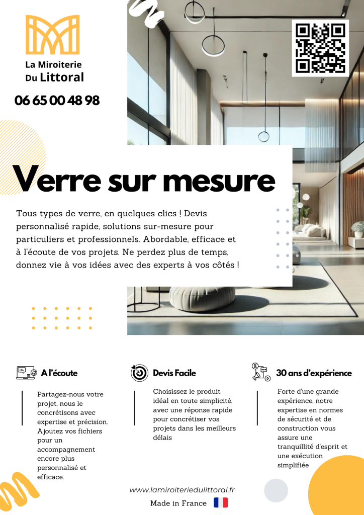 Previous Next Ajouter à mes favoris Partager sur Notre Histoire On vous propose La Miroiterie du Littoral - Miroitier à Biganos 33380Du Verre sur-mesure ! Forte d'une grande expérience de plus de 30 ans, notre expertise en normes de sécurité et de construction vous assure une tranquillité d'esprit et une exécution simplifiée. 30 ans d'expérience en tant que miroitier Nous proposons un panel de produits sur mesures :Dessus de table en verre trempéCrédence de cuisine en verre laqué de couleurDu verre d'insert -Miroirs clairs , bronze , gris Des verres feuilletés retardateur d'effractionDes doubles vitrages Garde-corps Dalle de sol Demande de contact × Nom Prénom Mail Téléphone Message Envoyer ma demande