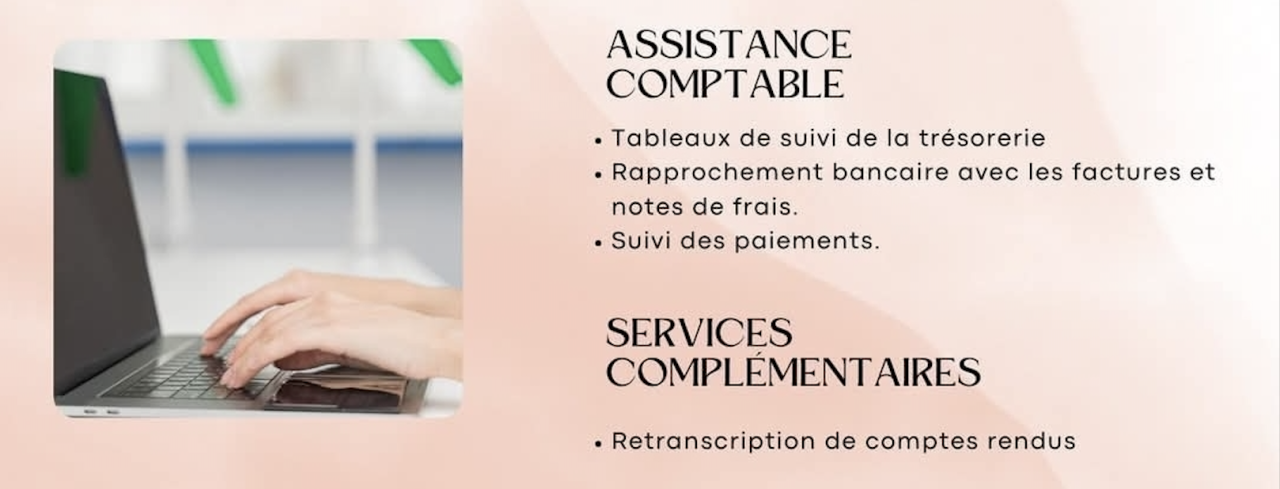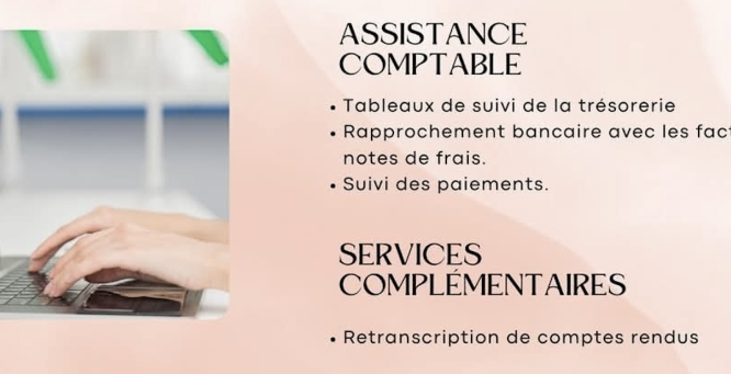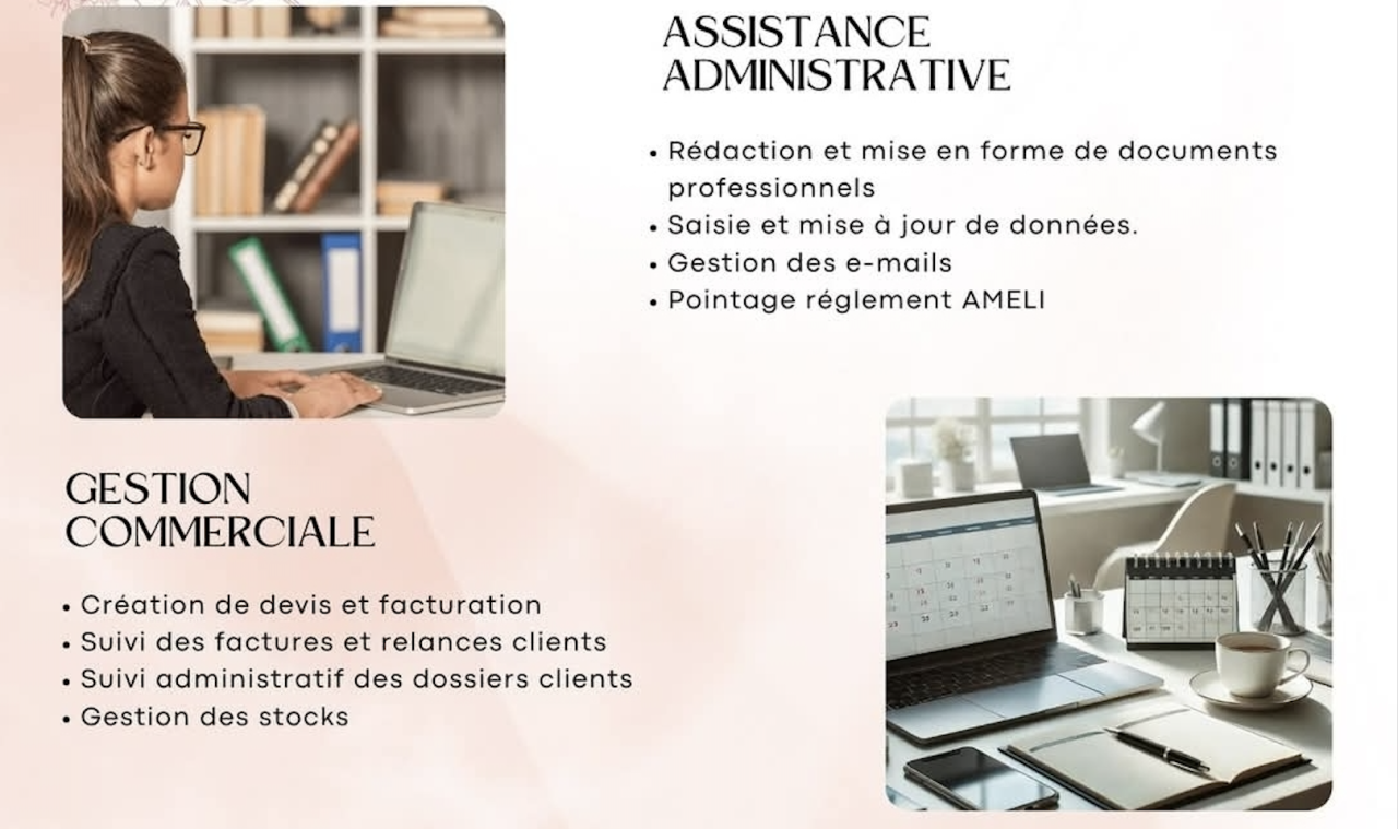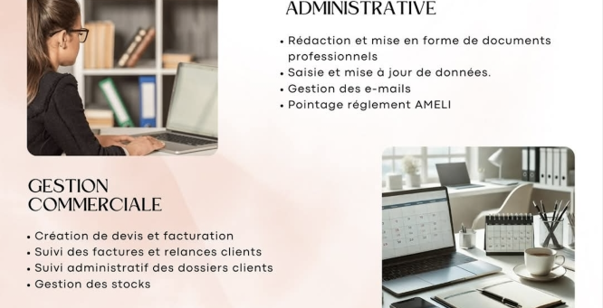 Previous Next Ajouter à mes favoris Partager sur Notre Histoire On vous propose Leyr'Assistante, secrétaire indépendante à Salles 33770Je m’adapte à vos besoins en proposant des solutions sur mesure : que ce soit pour un soutien ponctuel ou régulier, je vous aide à gagner du temps et à vous concentrer sur l’essentiel.ASSISTANCE ADMINISTRATIVE Rédaction et mise en forme de documents professionnels Saisie et mise à jour de données Gestion des e-mails Pointage règlement AMELIGESTION COMMERCIALE Création de devis et facturation Suivi des factures et relances clients Suivi administratif des dossiers clients Gestion des stocksASSISTANCE COMPTABLE Tableaux de suivi de la trésorerie Rapprochement bancaire avec les factures et notes de frais. Suivi des paiements.SERVICES COMPLEMENTAIRES Retranscription de comptes rendusPour toute autre prestation. Je me tiens à votre disposition. Formule découverte 5h d'accompagnement administratif Forfait à 150€ sans engagement Pour tester mes services en toute sérénité, évaluer l’intérêt d’une collaboration, et commencer à gagner du temps dès maintenant.https://leyrassistante.systeme.io/tarifs Demande de contact × Nom Prénom Mail Téléphone Message Envoyer ma demande